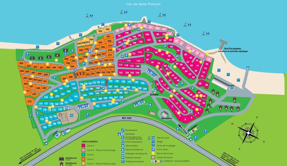 Camping Le Grand Large*** heeft terrasvormige staanplaatsen van verschillende grootte, in de zon of in de schaduw, op een harde ondergrond of gras. Overal op de camping is er uitzicht op en toegang tot het meer van Serre-Ponçon.
